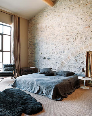 it's hard to believe that this impressive french home was once a 19th century oil mill. the transformation from work place to a home was created by interior designer Marie-Laure Helmkampf. the neutral color palette and rustic touches through the house give it cozy feel, but the pop of pale blue in the stone adds an interesting touch. the mixture of vintage furniture & modern fixtures and tables give the house an updated look.